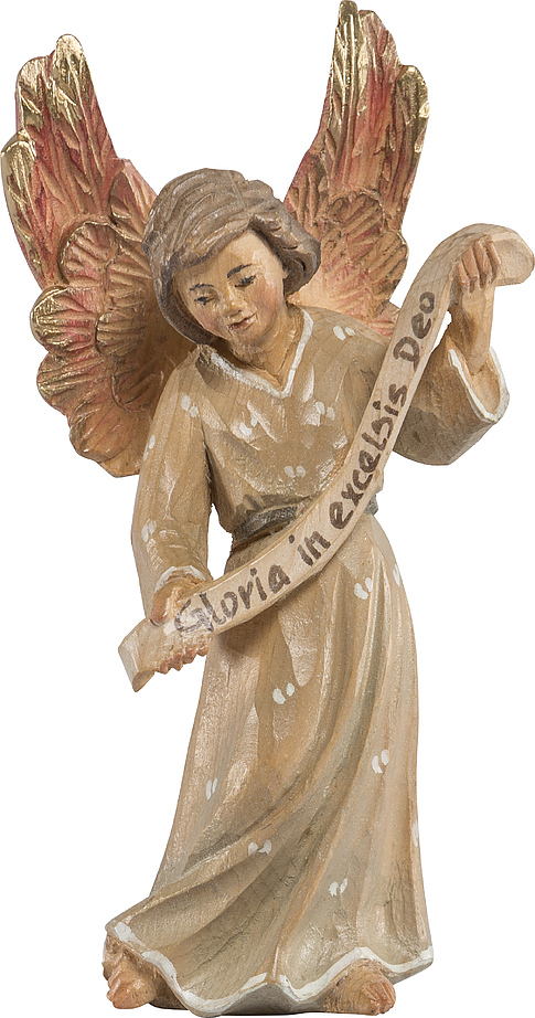 Der Gloriaengel ist eine wahre Lichtgestalt. Er bringt das „Gloria in excelsis Deo“ als Banner der Kundgebung und Verkündung voller Freude in die Szene der Krippe. Huldvoll prangt das „Ehre sei Gott in der Höhe“ als Spruchband vor seinem gleichsam elfenhaften fast astralem Körper. Die Glorie ist im christlichen Verständnis eines der göttlichen Attribute. Dieser Hymnus ist ein Lobpreis westkirchlicher Liturgien. Der Gloriaengel verkörpert diesen Lobpreis in jeder Hinsicht. Sein schwungvoller Faltenwurf unterstreicht seine Freude über die Geburt des Heilandes.