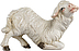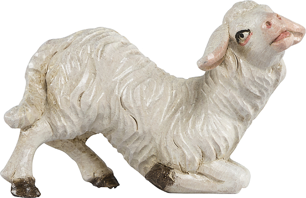 Die sowohl filigrane, als auch detailgetreue Nachbildung eines knienden Schafes ist ein Meisterwerk der manuellen Holzschnitzkunst. Der Kopf des Tieres ist leicht geneigt, während der Blick aus dem rechten Augenwinkel ein eindeutiges Ziel erfasst hat. Allein das reicht um zu wissen, wo das Schaf seinen Platz in der Krippe hat. Der Kniefall dient der anerkennenden Huldigung des Heilands, der als Neugeborenes direkt neben ihm im Stroh liegt. In dieser ahnungsvollen Demutshaltung bekundet das Schaf die Wahrhaftigkeit des Sohnes Gottes.