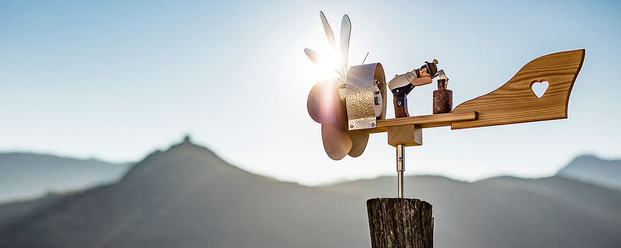 I nostri segnavento animati in legno massello di larice sono una meravigliosa decorazione da giardino e sono disponibili in molte dimensioni e design diversi. Grazie ai temi dei personaggi in movimento, sono un attrazione unica ed originale: streghe, spazzacamini, tirolesi e altre figure amorevolmente intagliate a mano sembrano guidare le pale stesse. Grazie alla loro lavorazione di alta qualità, sono resistenti alle intemperie, durevoli e silenziosi.